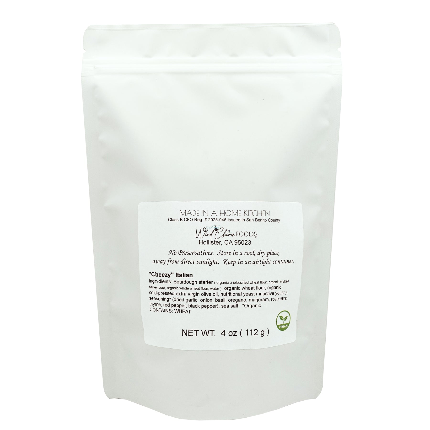 Wind Chime Foods' "Cheezy" Italian Sourdough Flats are topped with an authentic blend of herbs and nutritional yeast to give you the flavor of a cheesy Italian pizza without the dairy. This combination is great snacking right out of the bag or elevate your charcuterie board, dip, or salad with few flats on the side.