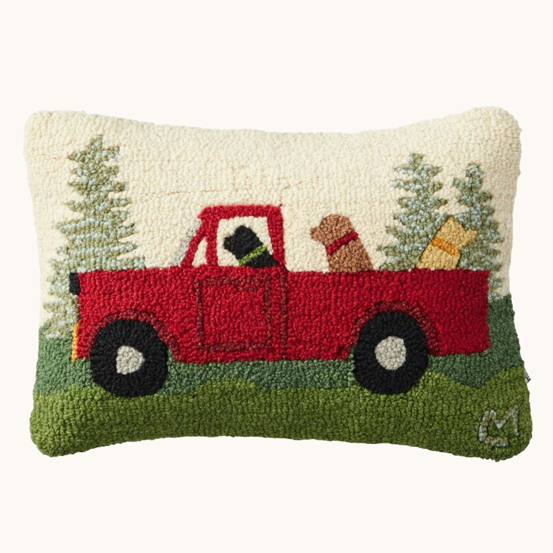 Get this whimsical pillow featuring a red vintage pickup truck, two dogs along for the ride in the back, and a surprise driver upfront.  This Caravan Of Dogs - 14" x 20" wool pillow has been hand-hooked with exceptional care by skilled craftsmen. The result is a premium decorative pillow that adds a charming touch of handcrafted excellence to any bed, sofa, or rocking chair.