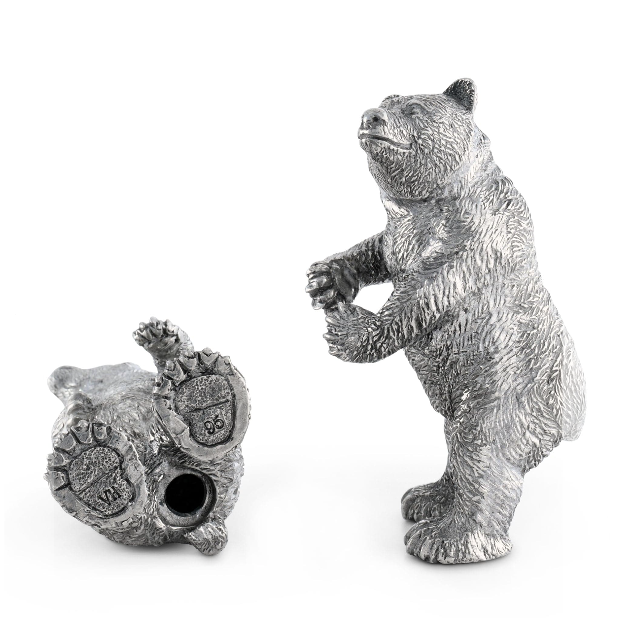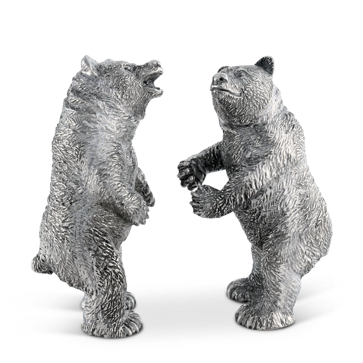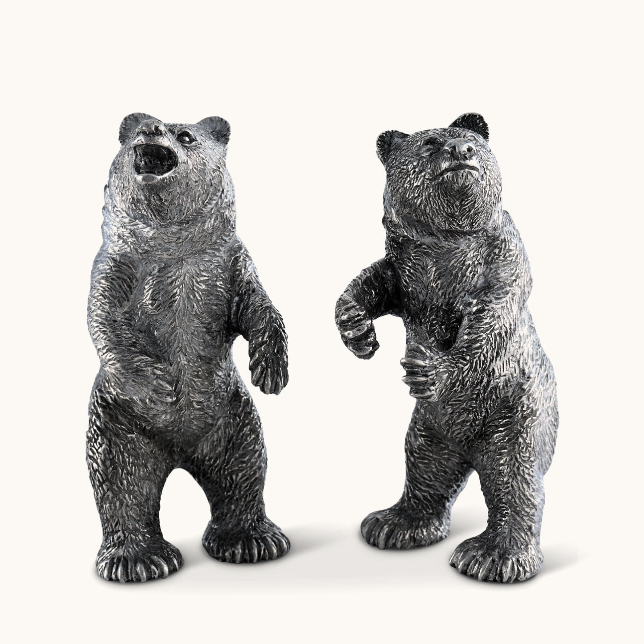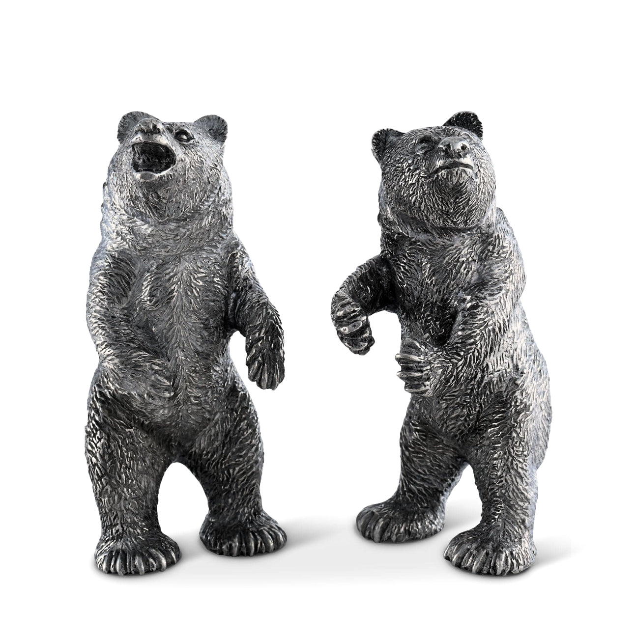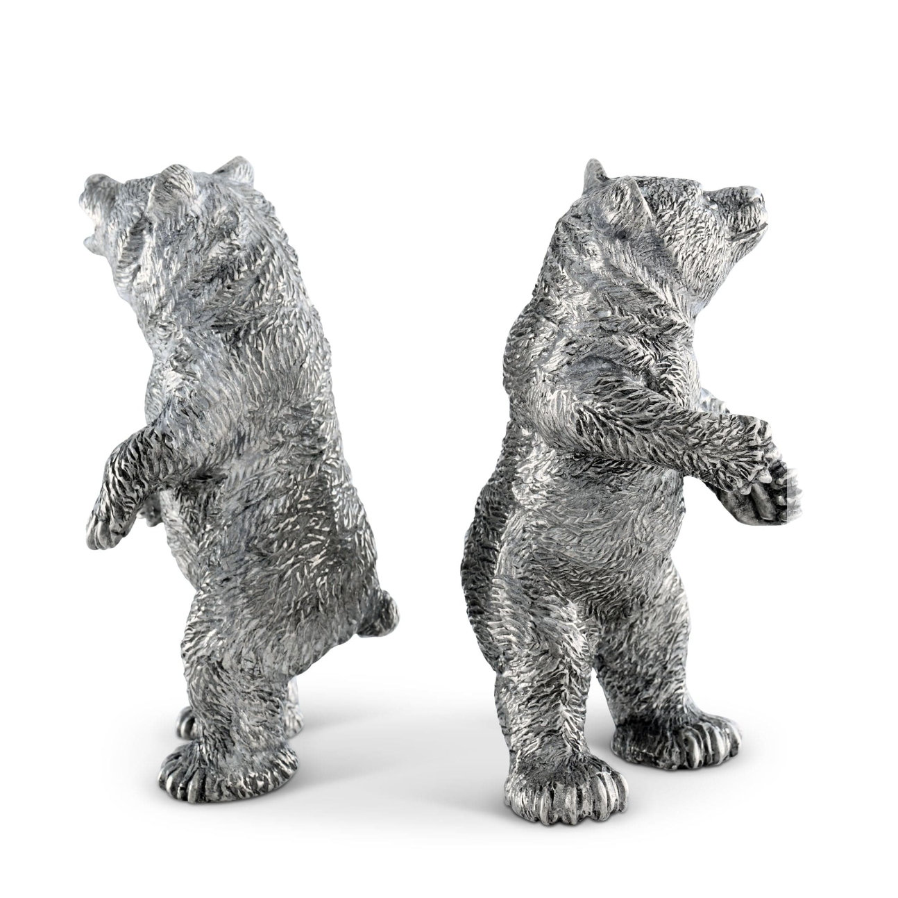 Elevate your table setting with these adorable grizzly bear salt and pepper shakers. Perfect for nature-lovers, these silver-tone cuties add a playful touch to your lodge-style decor. Each intricately designed with lead-free pewter, these forest-dwelling shakers are both sturdy and charming. Sprinkle some spice with these whimsical shakers as standalone centerpieces or pair them with other pieces from the collection for a cohesive grizzly bear theme. Don't miss the chance to add a bit of wild to your dining experience!